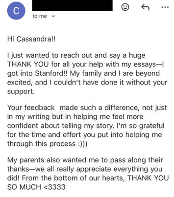 "These past couple of months working with Cassandra have been amazing. From restructuring my entire common app essay to helping me approach some extremely tricky prompts, Cassandra has helped me craft a story that I wouldn't have otherwise even imagined. And her edits and suggestions have polished my essays and expressed my writing how I intended to!"